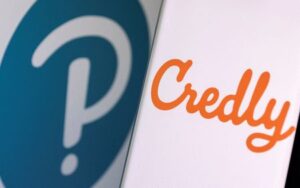 Credly logo is seen on a smartphone in front of a displayed Pearson logo in this illustration taken January 31, 2022. REUTERS/Dado Ruvic/Illustration