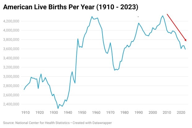 According to the research platform Microtrends, the current birth rate for the U.S. is 1.787 live births per woman. That’s less than the 2.1 births per woman a nation needs to simply replace itself from one generation to the next (excluding immigration).